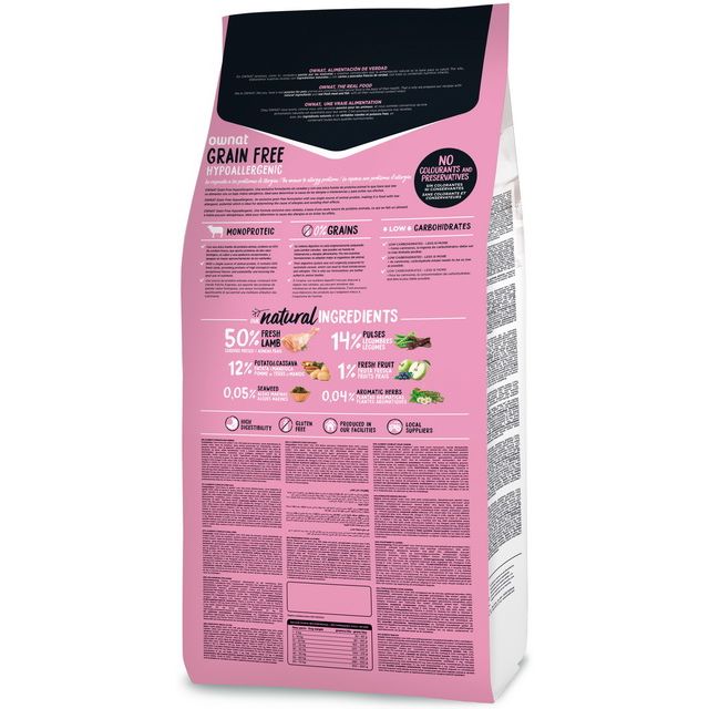 Scheda Prodotto Particolarmente indicato per cani di peso compreso tra 1 kg e 10 kg in età adulta, con sensibilità o intolleranze digestive o cutanee, rappresenta un''''ottima alternativa per differenziare tra allergie e intolleranze rispetto ad altre fonti proteiche. La formulazione contenente il 50% di agnello fresco, ricca di calorie e con un''''alta percentuale di proteine, risponde alle necessità metaboliche delle razze mini. Conservare in luogo fresco e asciutto. Agnello fresco* (Min. 50% prima dell''''estrusione), Agnello disidratato (14%), Grasso animale (conservato con antiossidanti naturali), Piselli interi* (9%), Radici di manioca* (9%), Baccello di carruba* (5%), Patata disidratata* (3%), Mela* (1%), Polpe di barbabietola, Olio di pesce (conservato con antiossidanti naturali), Salgemma*, Erba medica disidratata*, Frutto e mannano oligosaccaridi, Alghe marine disidratate* (500 mg/kg), Glucosammina (500 mg/kg), Yucca schidigera, Condroitina solfato (100 mg/kg), Mirtilli* (100 mg/kg), Timo* (80 mg/kg), Fiore di camomilla* (80 mg/kg), Finocchio* (80 mg/kg), Echinacea* (80 mg/kg), Tè verde* (80 mg/kg). *Ingredienti naturali Proteina: 27%, Contenuto di grassi: 18%, Fibre grezze: 3,5%, Materia inorganica: 9,5%, Umidità: 8%, Omega 6: 2,6%, Omega 3: 0,25%, Calcio: 1,8%, Fosforo: 1,2%.