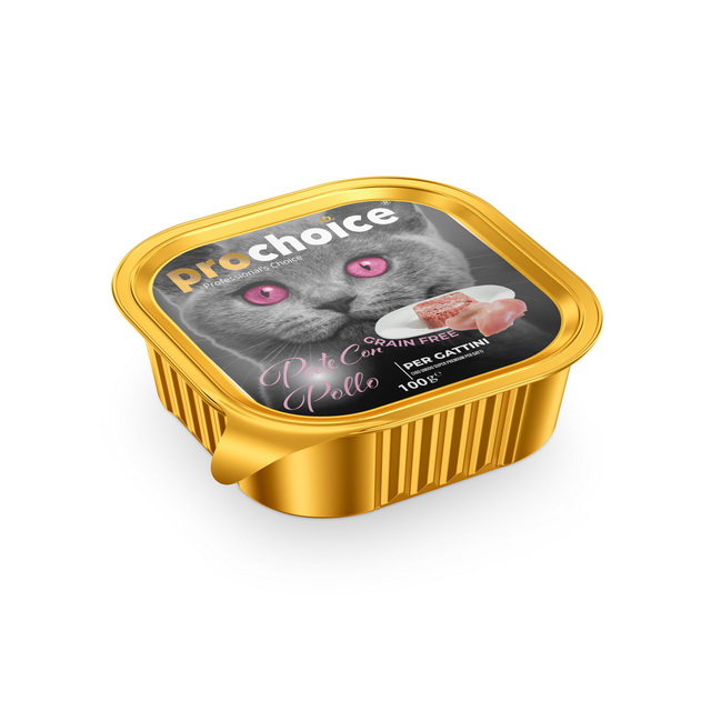 Scheda Prodotto PROCHOICE PATE'''' CON POLLO PER GATTINI 100 GR VASCHETTA Composizione: Carne e derivati (Pollo min. 4%), derivati di origine vegetale, minerali. Additivi per Kg: Additivi Nutrizionali: Vitamina A 2.000 UI/Kg, Vitamina D3 200 UI/Kg, Vitamina E 20 UI/Kg, Zinco (Solfato di Zinco Monoidrato) 10,0 mg/kg, Manganese (Solfato manganoso Monoidrato) 5,0 mg/kg, Selenio (Selenito di Sodio) 0,04 mg/kg, Iodio (Iodato di Calcio anidro) 0,50 mg/kg, Taurina 500 mg/kg.Componenti analitici (%) Proteine ??8,5 Grassi 6,0 Cenere 2,0 Fibre 0,4 Umiditą 80. EN:Composition: Meat and animal derivatives (min. 4% chicken), derivatives of vegetable origin, minerals. Additives per kg: Nutritional additives: Vitamin A 2,000 IU/kg, Vitamin D3 200 IU/kg, Vitamin E 20 IU/kg, Zinc (Zinc Sulfate Monohydrate) 10.0 mg/kg, Manganese (Manganous Sulfate Monohydrate) 5.0 mg/kg, Selenium (Sodium Selenite) 0.04 mg/kg, Iodine (Calcium Iodate Anhydrous) 0.50 mg/kg, Taurine 500 mg/kg. Analytical constituents (%) Protein 8.5 Fat 6.0 Ash 2.0 Fiber 0.4 Moisture 80