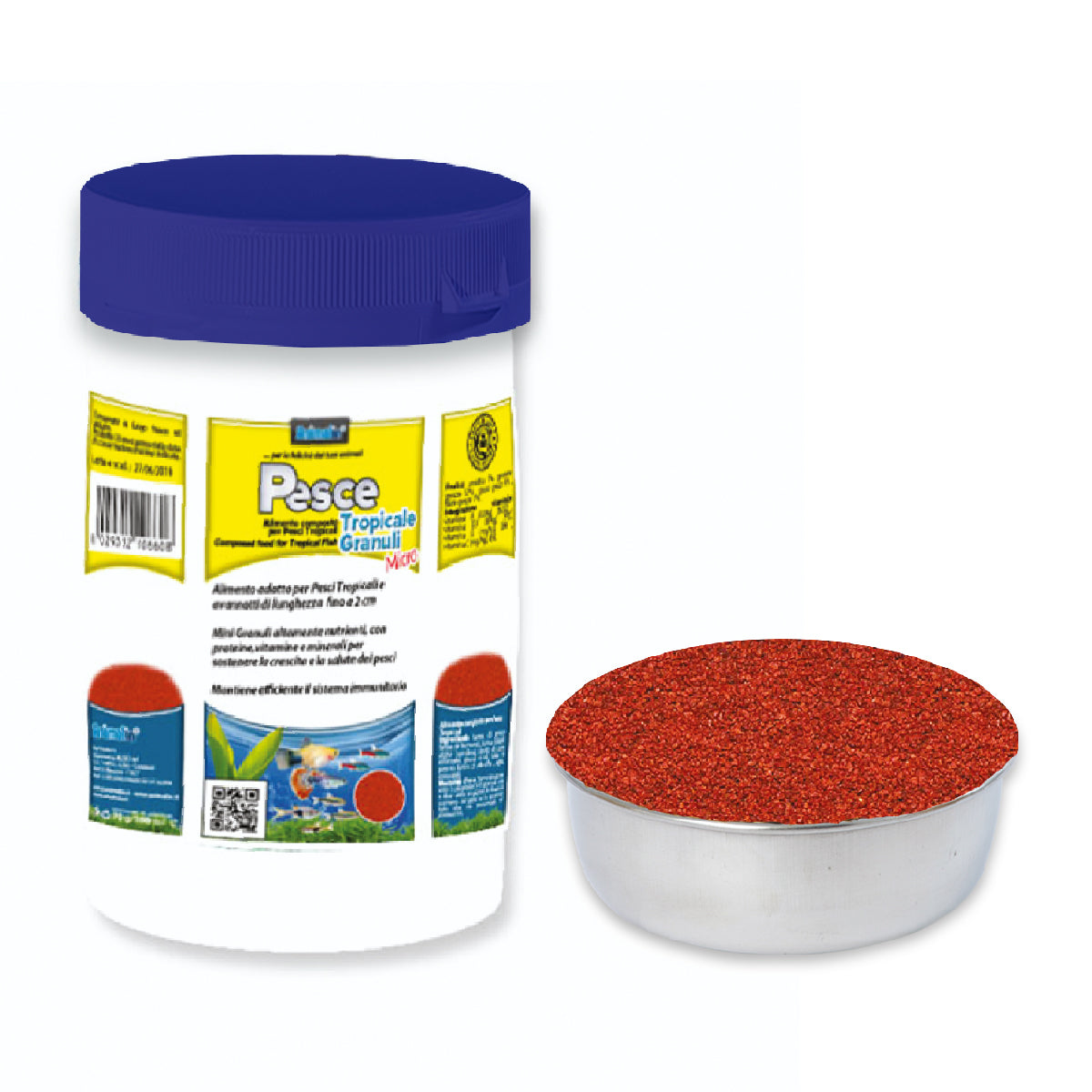 Alimento in micro granuli per pesci tropicali e avannotti fino a 2 cm