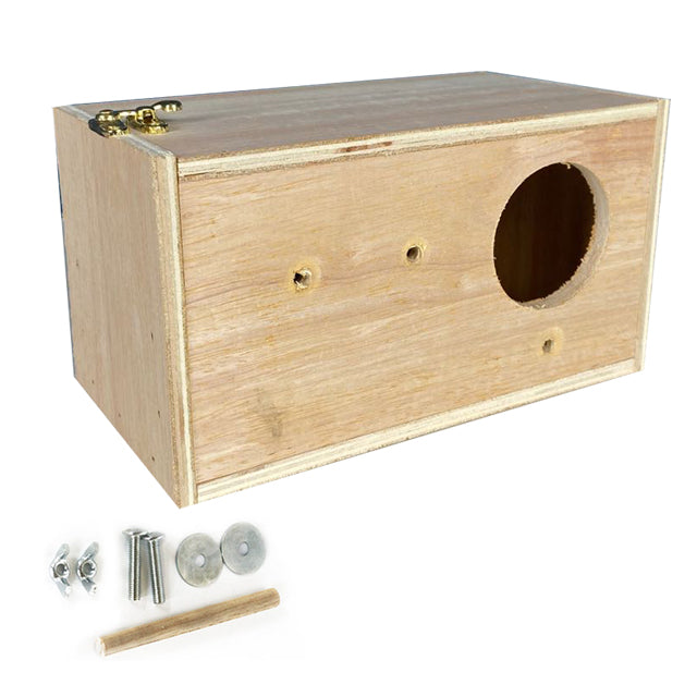 Descrizione: Nido in legno naturale progettato per inseparabili e piccoli pappagallini. Offre un rifugio sicuro e confortevole dove gli uccelli possono riposare, nidificare e sentirsi protetti. Realizzato con materiali resistenti e sicuri, ideale da posizionare nella gabbia per garantire il benessere e la serenità dei tuoi volatili.