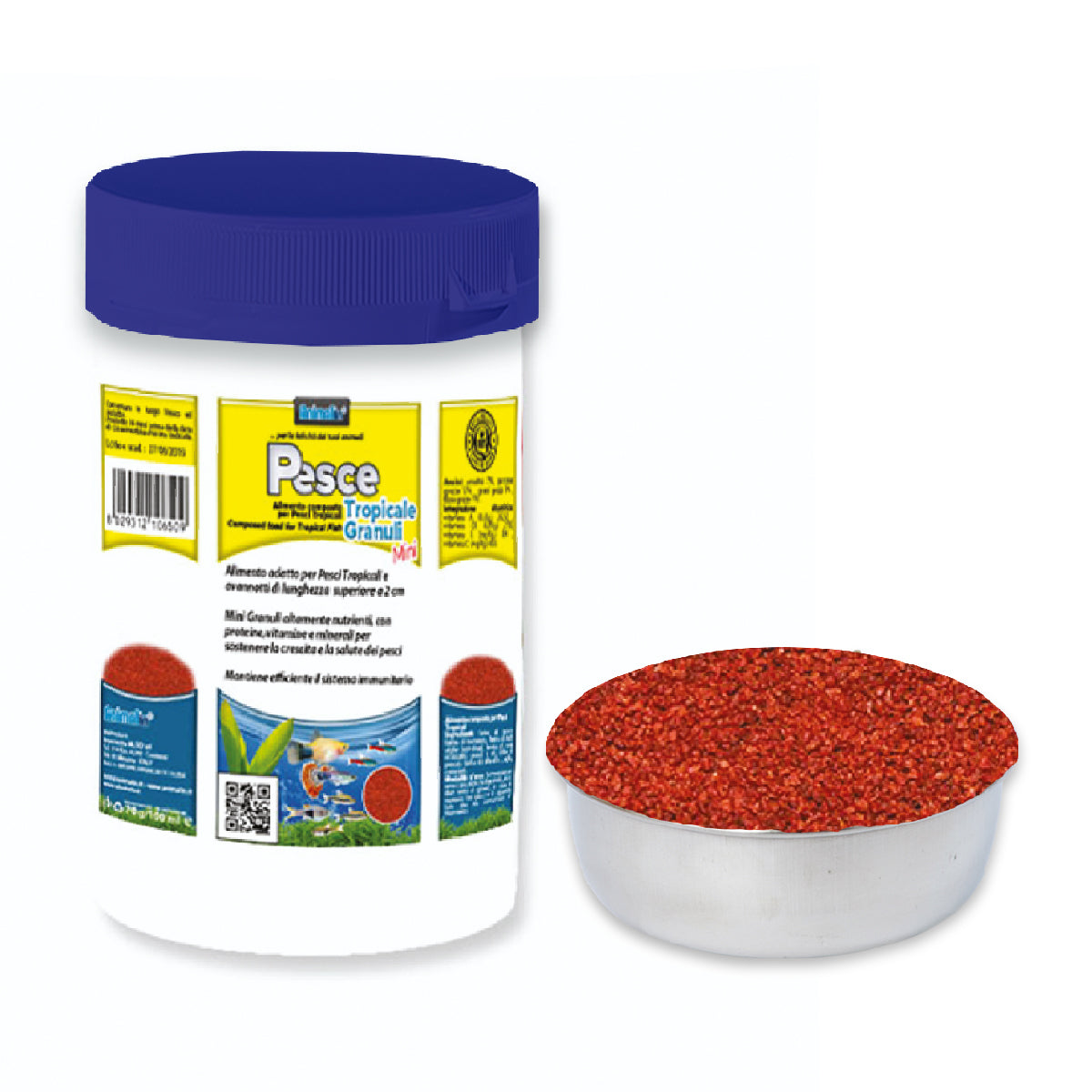 Alimento in mini granuli per pesci tropicali e avannotti di lunghezza superiore a 2 cm