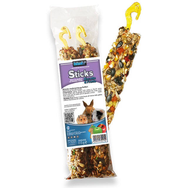 IT Alimento complementare per Roditori. Bastoncini con biscotto e frutta. Composizione: grano, farina, mais, avena in fiocchi senza buccia, miglio, semi di girasole neri, biscotti 5%, sorgo, misto frutta 2,5%, semi di cardo, semi di girasole a strisce, miglio rosso, semi di lino.EN Complementary food for Rodents. Sticks with biscuit and fruit.Composition: wheat, flour, corn, flaked oat-free oats, millet, black sunflower seeds, 5% biscuits, sorghum, mixed fruit 2.5%, thistle seeds, striped sunflower seeds, red millet, flaxseed .ES Comida complementaria para roedores. Palitos con galletas y fruta.Composición: trigo, harina, maíz, copos de avena sin copos, mijo, semillas de girasol negras, 5% galletas, sorgo, fruta mixta 2.5%, semillas de cardo, semillas de girasol rayado, mijo rojo, semillas de lino.FR Nourriture complémentaire pour les rongeurs. Bâtons avec biscuit et fruits.Composition: blé, farine, maïs, flocons d'avoine floconnés, millet, graines de tournesol noires, 5% de biscuits, sorgho, fruits mélangés 2,5%, graines de chardon, graines de tournesol rayées, millet rouge, graines de lin.
