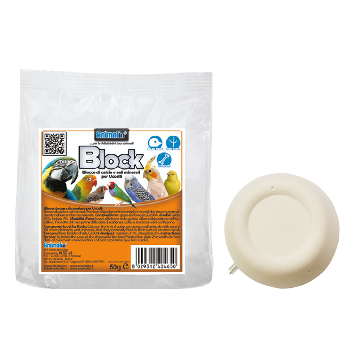 Alimento complementare per uccelli, ricco di calcio e minerali essenziali per ossa, muscoli e piumaggio.