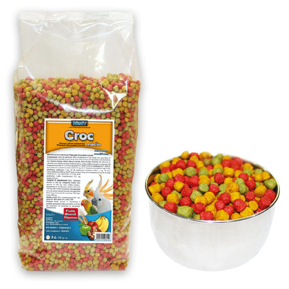 Alimento estruso composto. Composizione: farina di granoturco, farina di estrazione di soia tostata non ogm, farina di frumento, farina di pisello proteico, frutta (min. 20% nocciole, arachidi pelate, mela disidratata, uva sultanina, banane, datteri), farina di carrube, farina di polpa di bietola, oli, carbonato di calcio da rocce calciche macinate, fosfato bicalcico, inulina, additivi coloranti e conservanti CEE. MINI (per Parrocchetti e Cocoriti); MEDIO (per Pappagalli, Parrocchetti e Cocoriti); GRANDE (per Grandi Pappagalli).