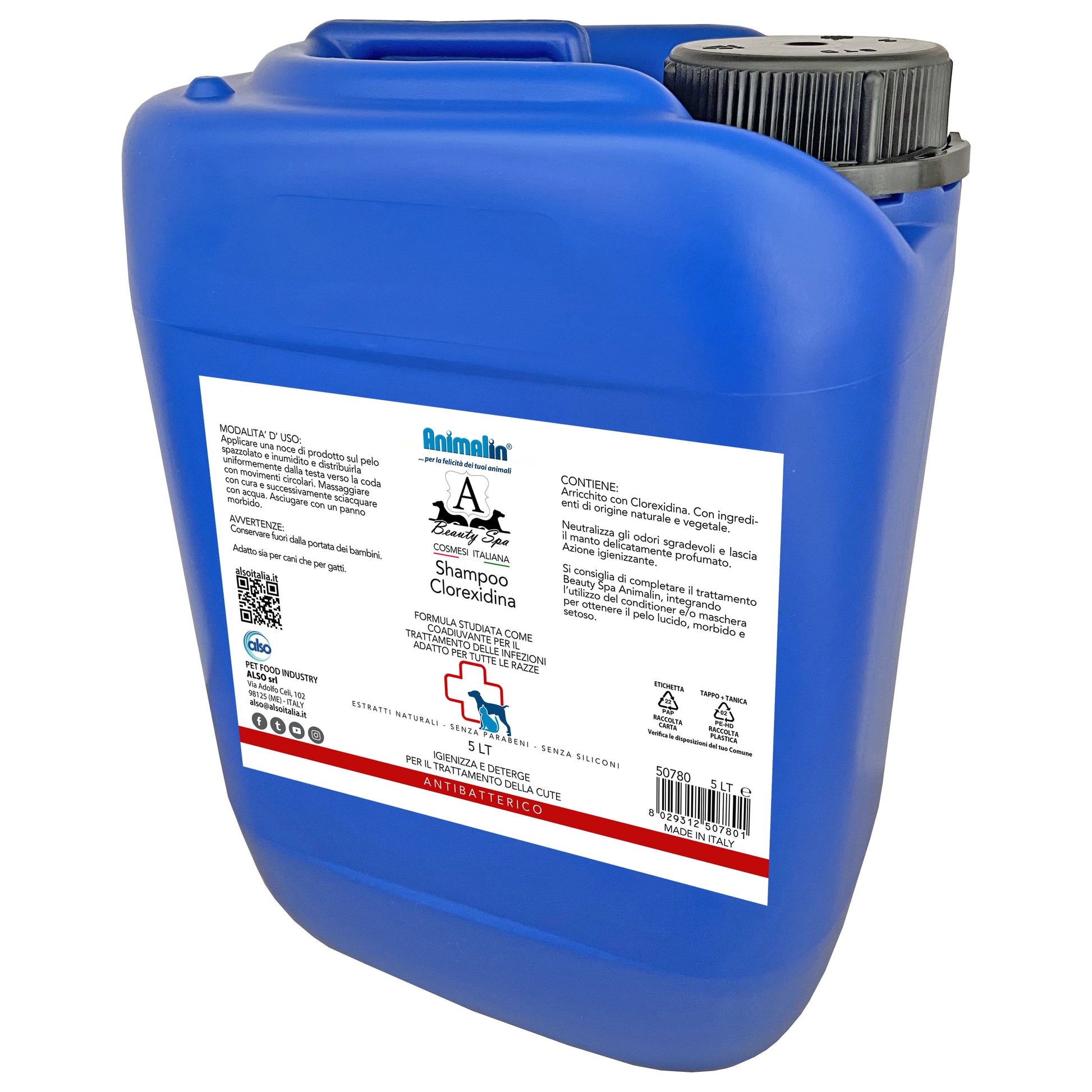 Beauty Spa Animalin Shampoo arricchito con Clorexidina ad attivit� antibatterica. Presenta un�efficace azione pulente. Modo d�uso: Bagnare accuratamente il mantello del cane e spalmare piccole quantit� di prodotto frizionando contro pelo. Risciacquare con cura. Disponibile nel flacone da 300ML e nella tanica da 5L. La linea Beauty spa Animalin si completa con il balsamo conditioner, dalla maschera volumizzante e lucidante pelo, iginizzante polpastrelli e pelo, gel calmante lenitivo dolori. Beauty Spa Animalin Shampoo Clorexidina PLUS: con Clorexidina ad azione antibatterica