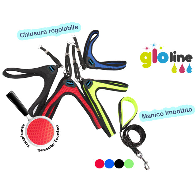 Set Pettorina e Guinzaglio per cani con chiusura a laccio regolabile e bordatura in morbido materiale retato traspirante. La chiusura con bloccaggio consente facile vestibilita' e maneggevolezza. Disponibile in rosso, blu, nero e verde mela. Varie misure.