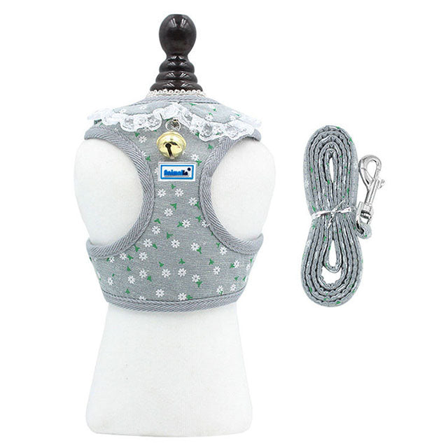 Pettorina delicata e romantica con colletto e campanellino, completa di guinzaglio coordinato.