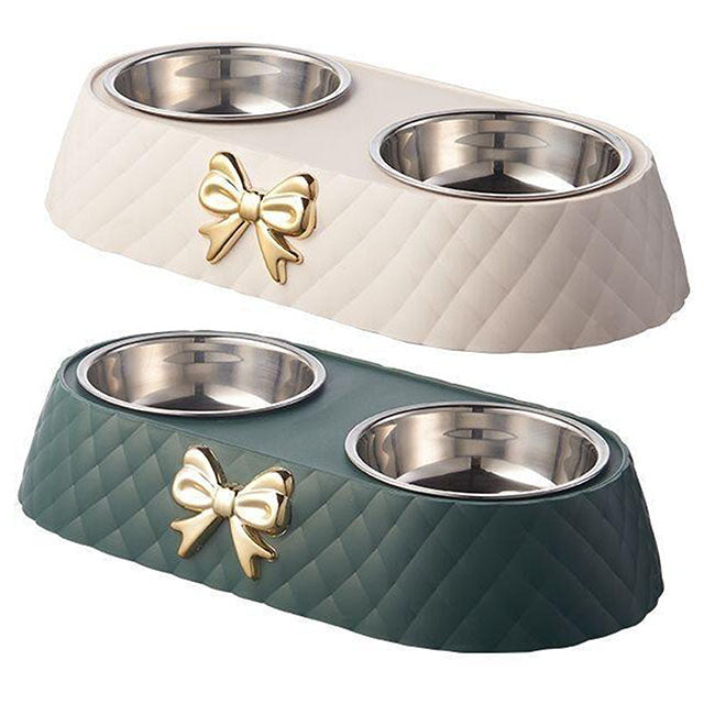 IT Elegante Ciotola in plastica resistente con due ciotole estraibili in acciaio ossidabile per cani e gatti. Con gommini antiscivolo. Le doppie ciotole consentono anche di nutrire due animali contemporaneamente. Disponibile nei colori crema e verde inglese. EN Elegant bowl in resistant plastic with two removable bowls in oxidizable steel for dogs and cats. With non-slip rubber pads. The double bowls also allow you to feed two animals at the same time. Avaible in cream and english green color.
