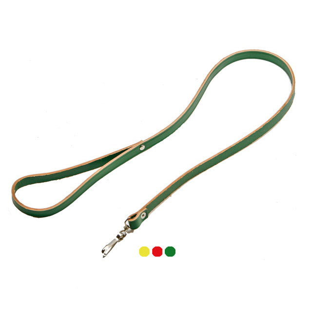 Guinzaglio in cuoio sfoderato con moschettone simplex. Colori assortiti: giallo, rosso, verde. Prodotto italiano.
