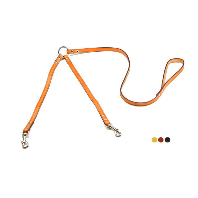 Guinzaglio doppio per due cani in cuoio cucito. Colori assortiti: naturale, marrone, nero. Prodotto italiano.