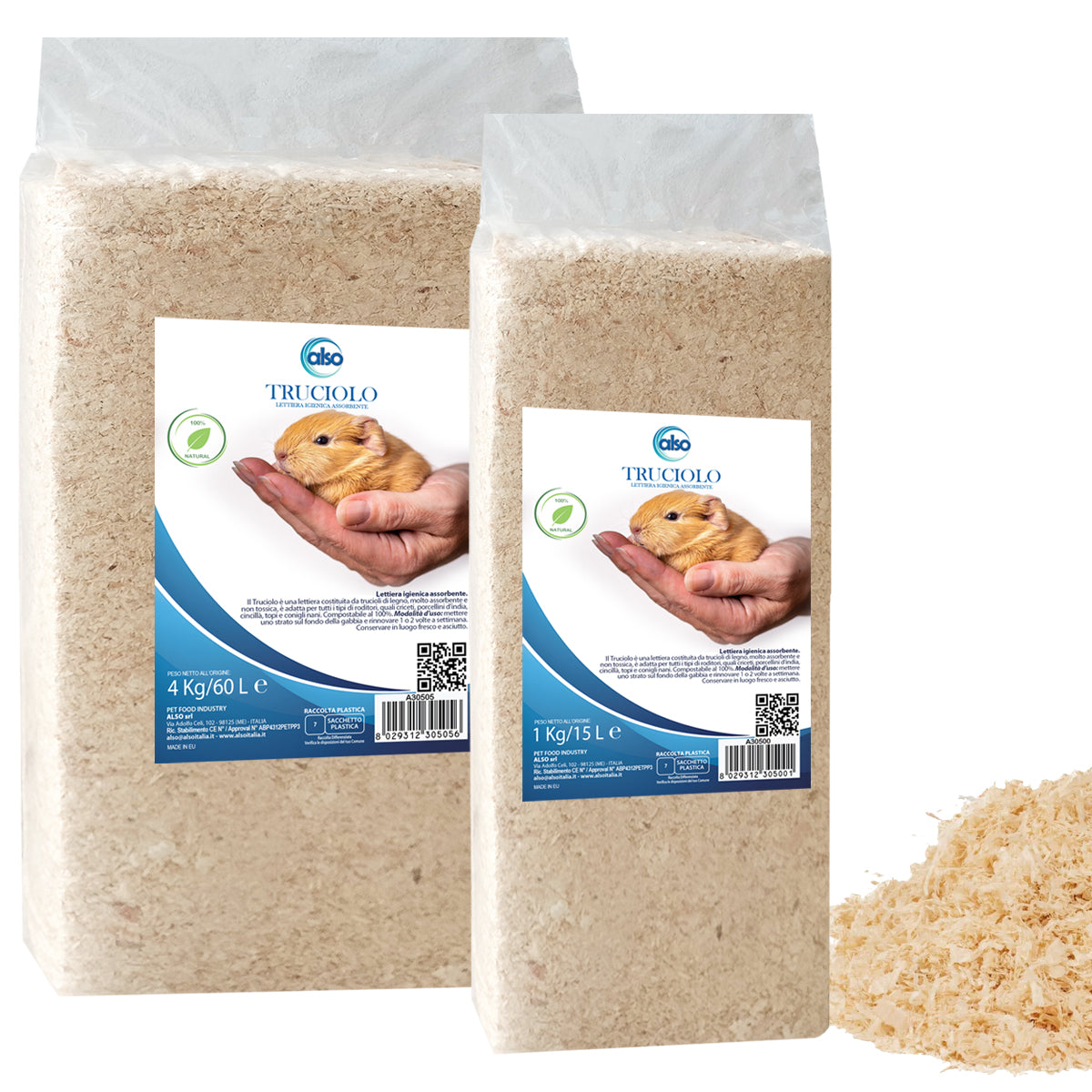 Lettiera igienica assorbente.Il Truciolo è una lettiera costituita da trucioli di legno, molto assorbente e non tossica, è adatta per tutti i tipi di roditori, quali criceti, porcellini d’india, cincillà, topi e conigli nani. Compostabile al 100%.